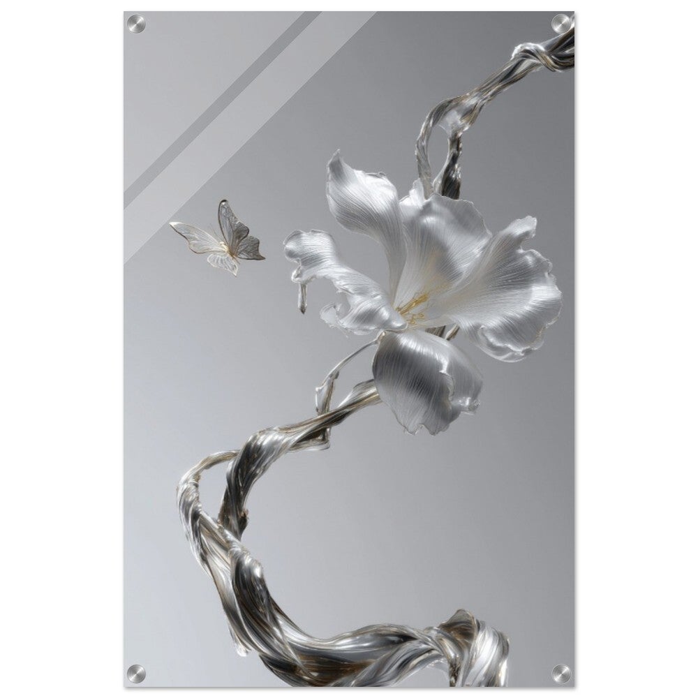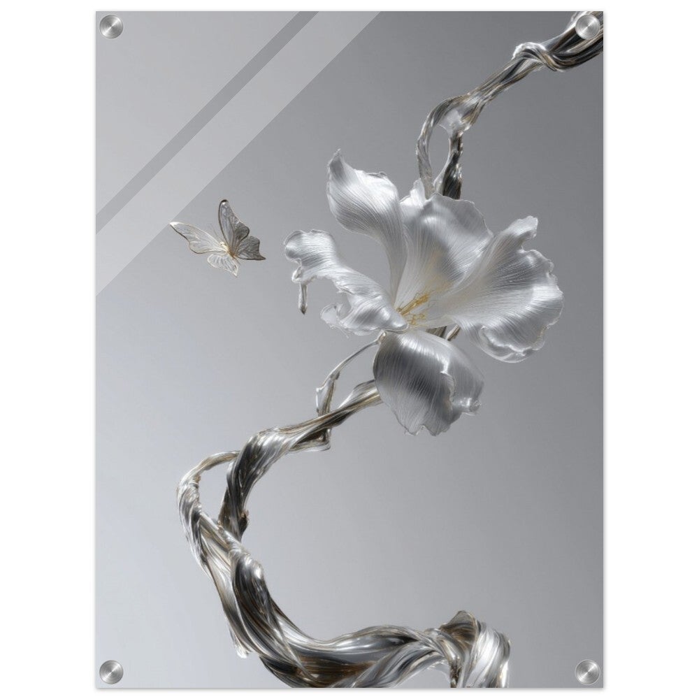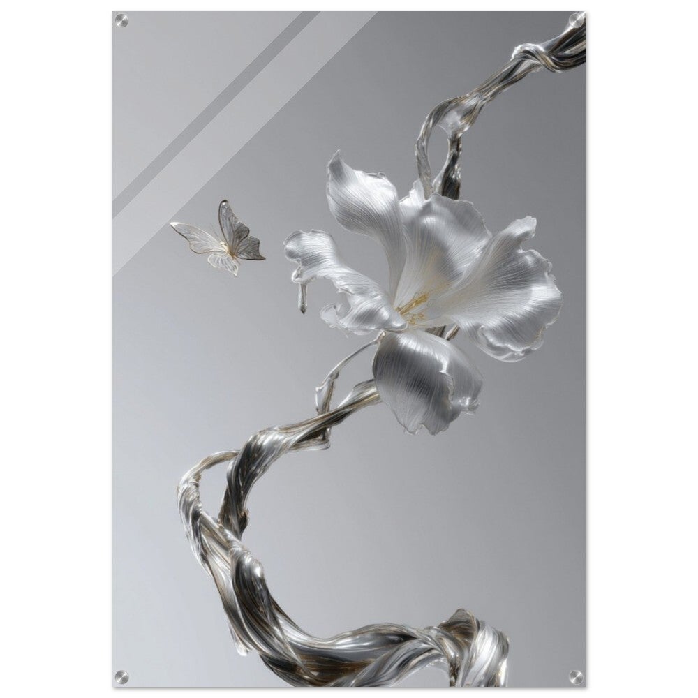 Face à cette fleur précieuse, un papillon argenté flotte en apesanteur. Ses ailes fines et lumineuses semblent vibrer d’une énergie douce et subtile. La scène entière évoque une rencontre suspendue dans le temps : la fragilité de la nature se mêle à la sophistication moderne du métal et du verre.